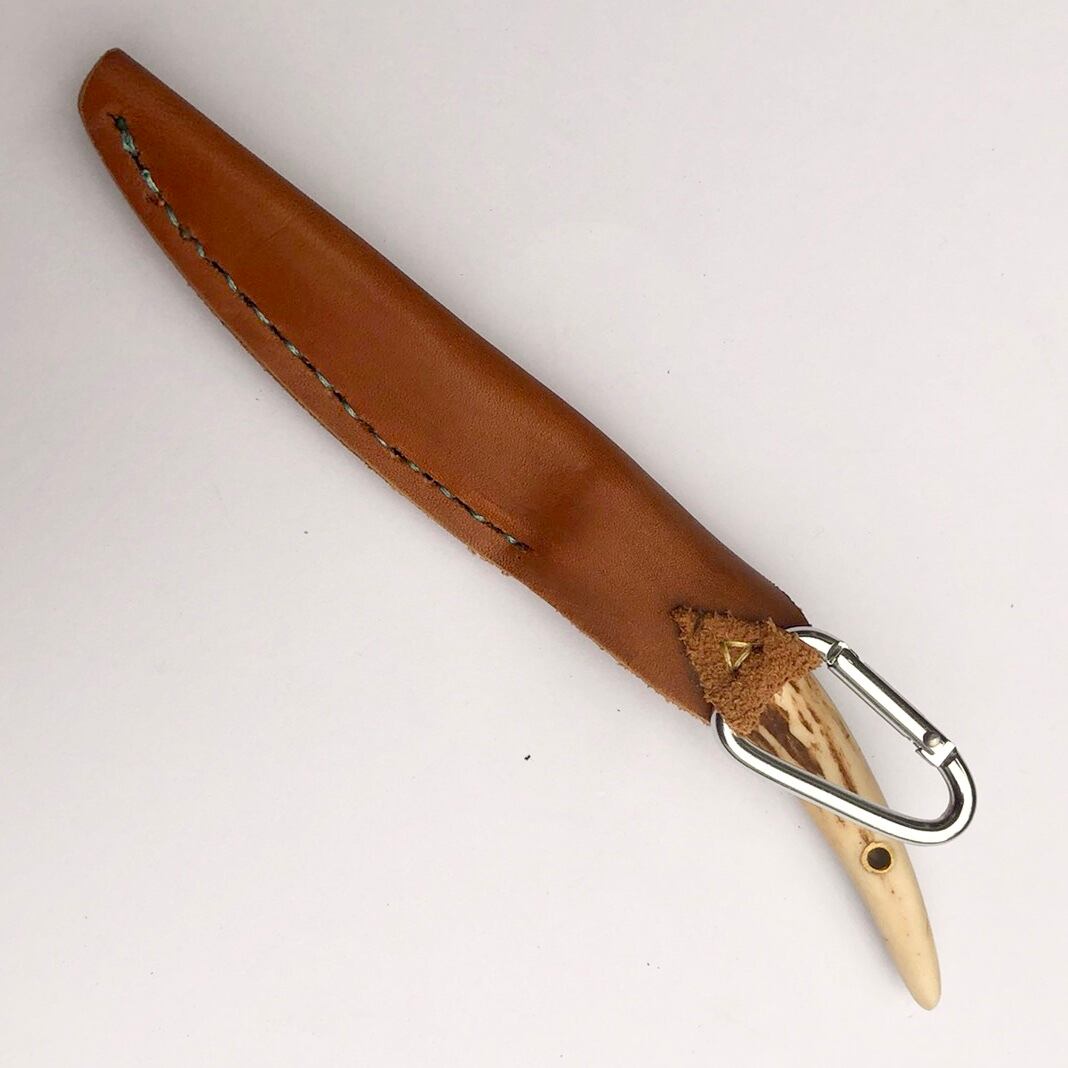 知人が仕留めた鹿の角のスタイリッシュナイフ。小ぶりで軽く小回りの利きやすいタイプです。角の模様が出す美しさは自然の生き物がならではの造形美。柄の固定部は真鍮で温かみのあるゴールドになっています。ベルト紐に掛けられるストラップ付き手縫いの牛革製カバーのセットです。